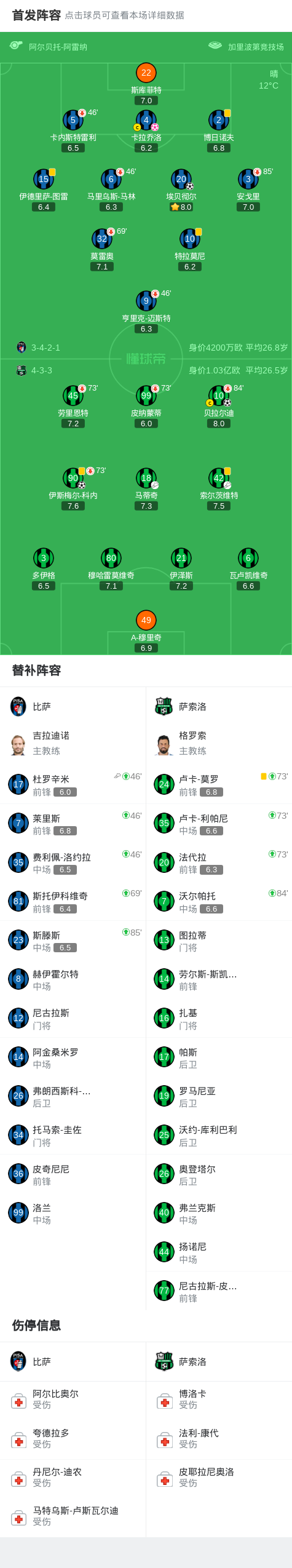 北京时间1月31日意大利足球顶级联赛 联赛 第23轮,比萨主场对阵萨索洛。比萨埃贝彻尔破门,卡拉乔洛自摆乌龙。萨索洛贝拉尔迪破门,伊斯梅尔-科内破门。最终比分比萨 1-3 萨索洛。